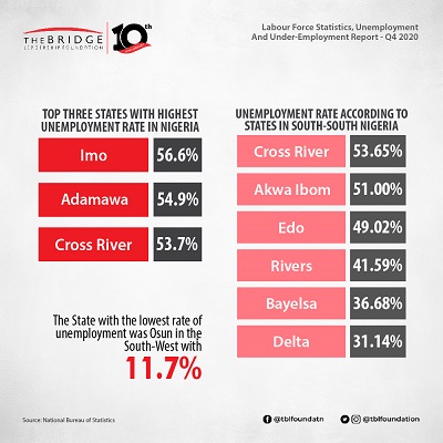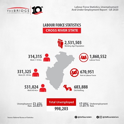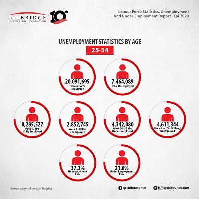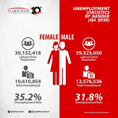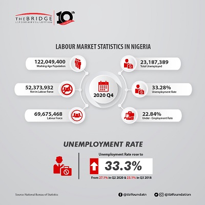According to the recently released Labour Force Report by the National Bureau of Statistics (NBS), Nigeria’s unemployment rate as at the end of 2020 was 33.3%, an increase from the 27.1% recorded in Q2, 2020. The underemployment rate declined from 28.6% in Q2, 2020 to 22.8%.