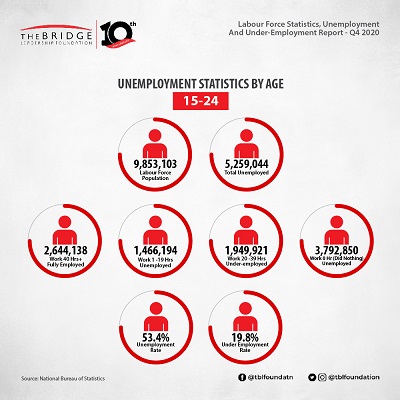 The unemployment rate among young people (15-34years) in the fourth quarter of 2020, was 42.5% up from 34.9%. Most persons within the age group of 15-24 are involved in one form of schooling or the other, hence are not willing and/or available for work.